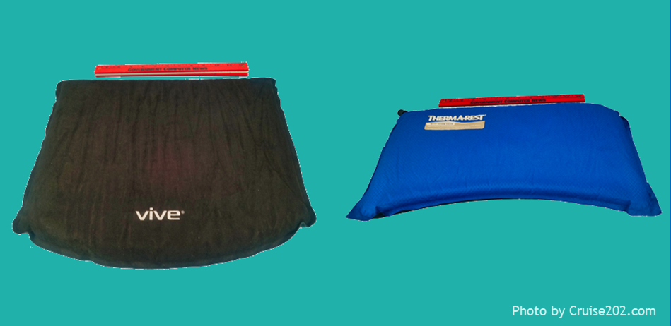 Does your butt get sore from the lightly padded seats in modern aircraft? Do you have difficulties getting up from low seats? In this post, I will address these two problems with one solution. Many of the older cruisers with whom I travel have difficulties getting out of seats since many chairs are very low and their knees not so steady. An extra few inches eases the effort for them. Others, like me, find that airline seats are not very comfortable, especially after a few hours. In order to address these two problems, I researched inflatable seat cushions that could easily be carried while traveling.